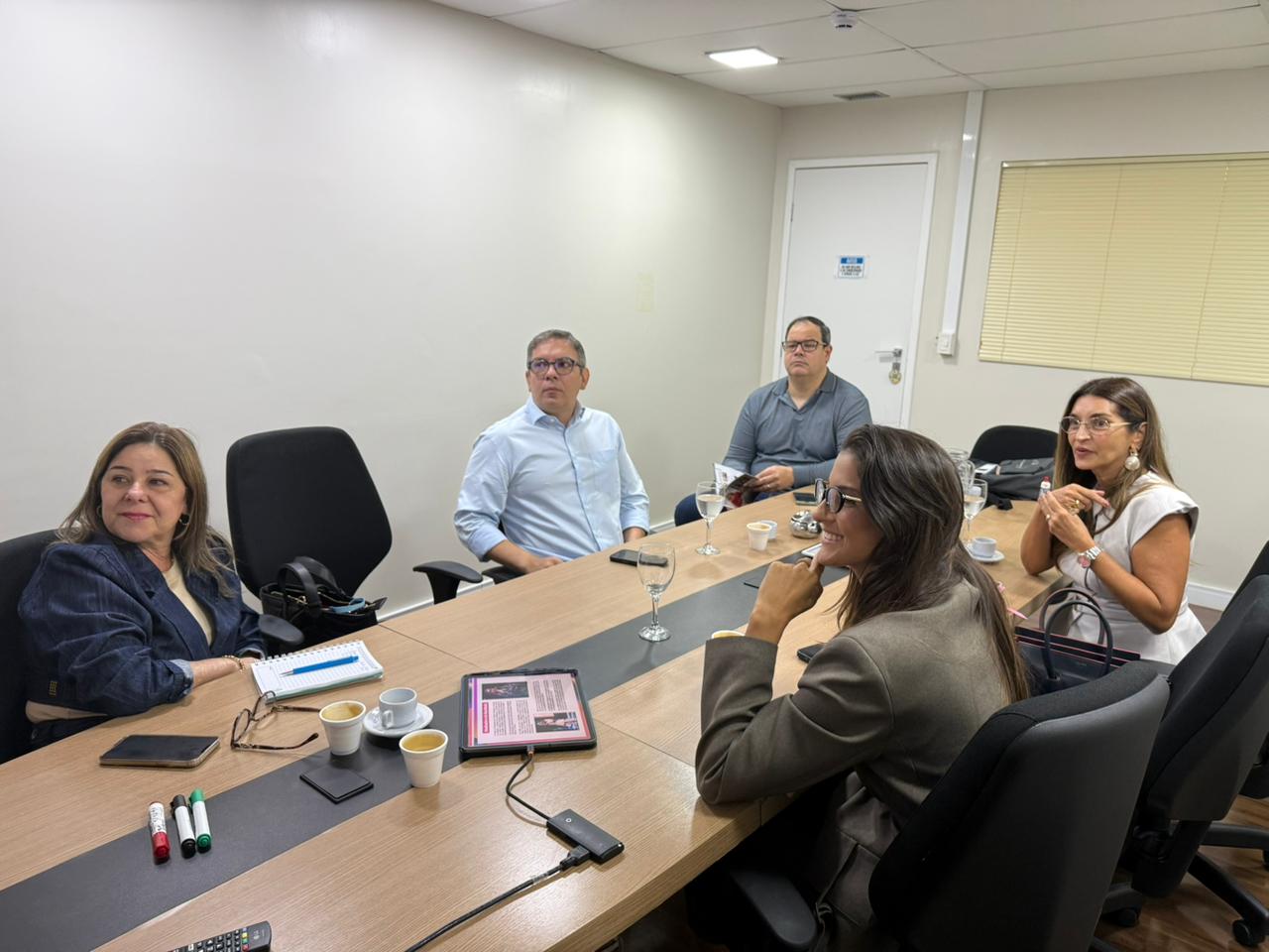 A reunião contou com a presença de Paulo Rabelo Pinheiro, presidente do SindRoupas; Darcyla de Freitas Lima, gerente de Desenvolvimento Regional e Municipal; Rafael Aureliano Gonçalves Branco, diretor de Suporte a Negócios da Agência de Desenvolvimento do Estado do Ceará (Adece); Márcia Travessoni, publicitária e fundadora da Plataforma MT; e Thaís Cunha, assessora executiva de Comunicação e Eventos do SindRoupas.